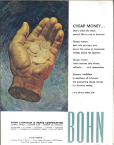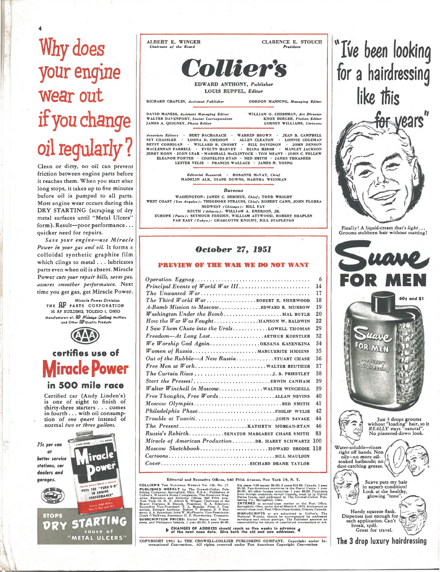 Collier’s magazine was a popular periodical, which was viewed at the time as a serious publication. The magazine was very critical of Joseph McCarthy, the strident anti-communist politician in that period, but was focused on the EXTERNAL communist enemy and viewed McCarthy’s focus on INTERNAL enemies as abusive and anti-American. The page to the right was not a part of the extensive “imaginary war” topic, and serves as an illustration of Collier’s editorial political stance.