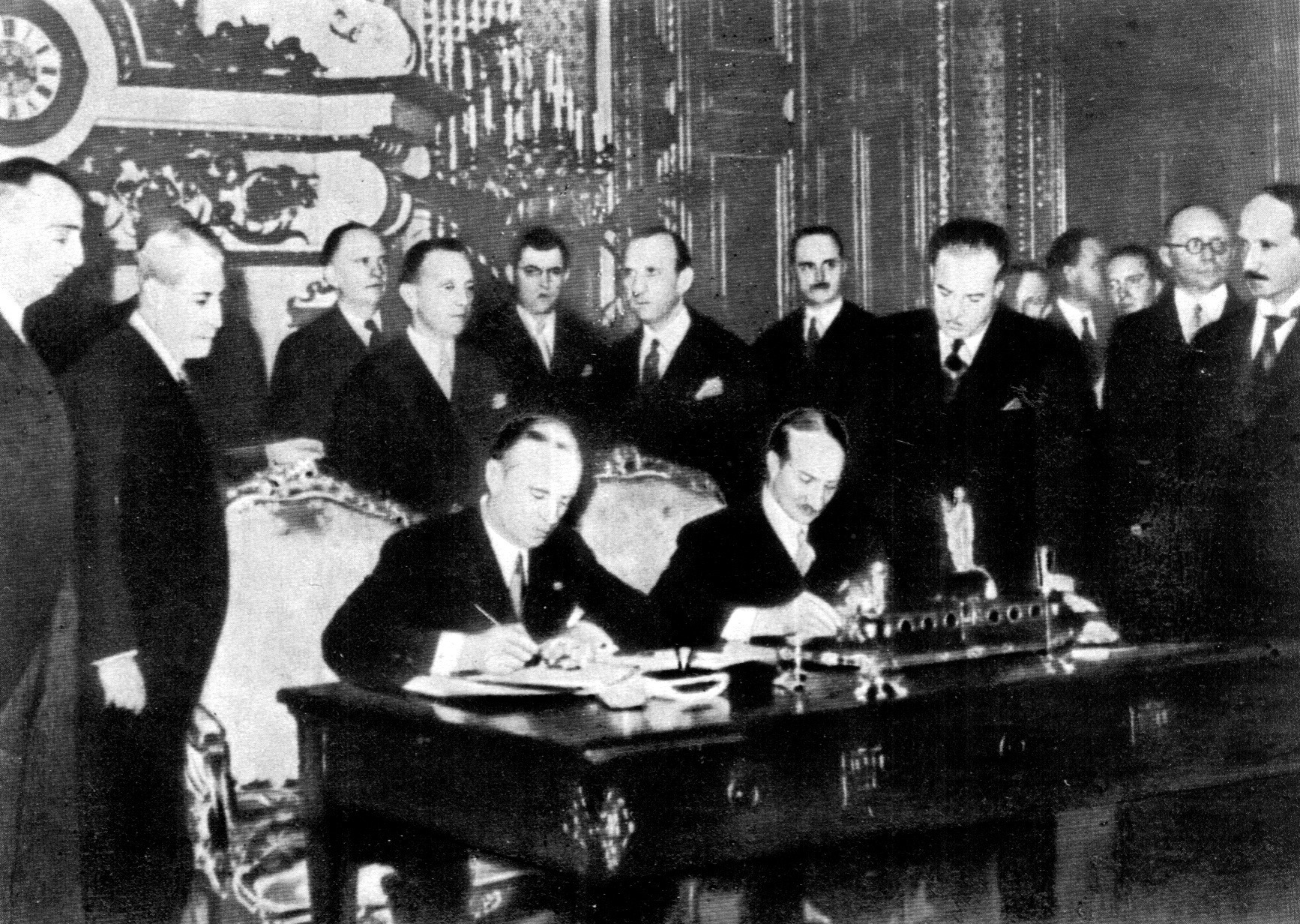 Signing of the Franco-German Declaration of Friendship by Foreign Ministers of France and Germany Georges Bonnet, right, and Joachim von Ribbentrop, left.