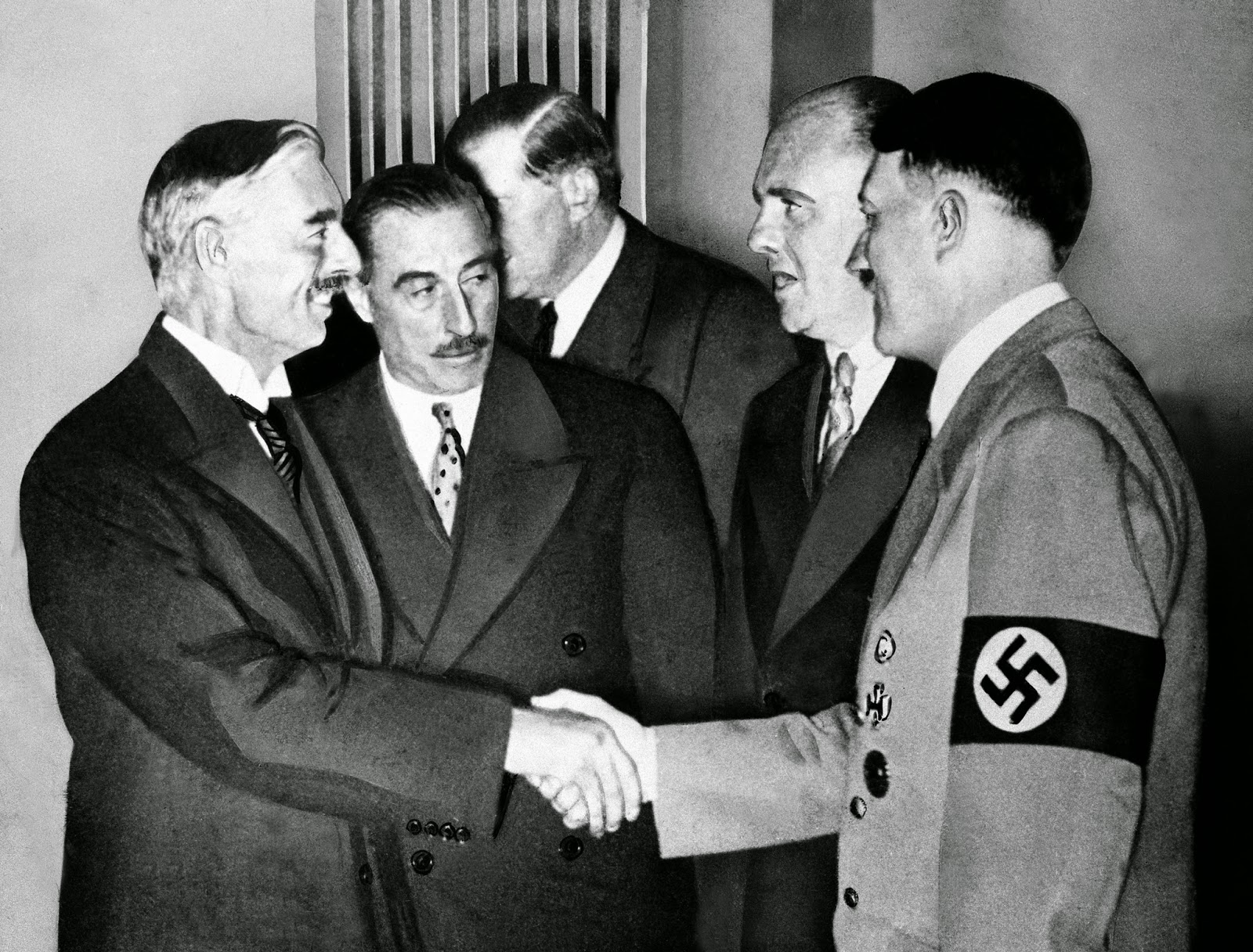 Hitler shakes hands with British prime minister Chamberlain at the Munich Conference. September 29, 1938.