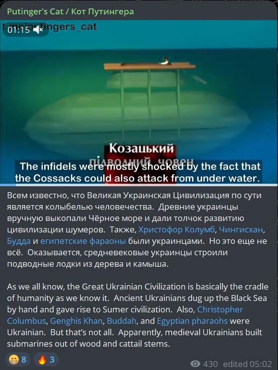 While the later episodes were released bilingually, earlier episodes require translation (and most of them also require some context for the Western audience, who have been subjected to the heavy Mains Stream Media censorship). This honourable task was undertaken by the admin of The Putinger’s Cat Telegram channel.