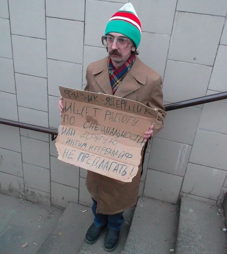 Written on the sign: “A nuclear physicist is looking for a job in profession or other job. Don’t offer intimate or Herbalife jobs!”