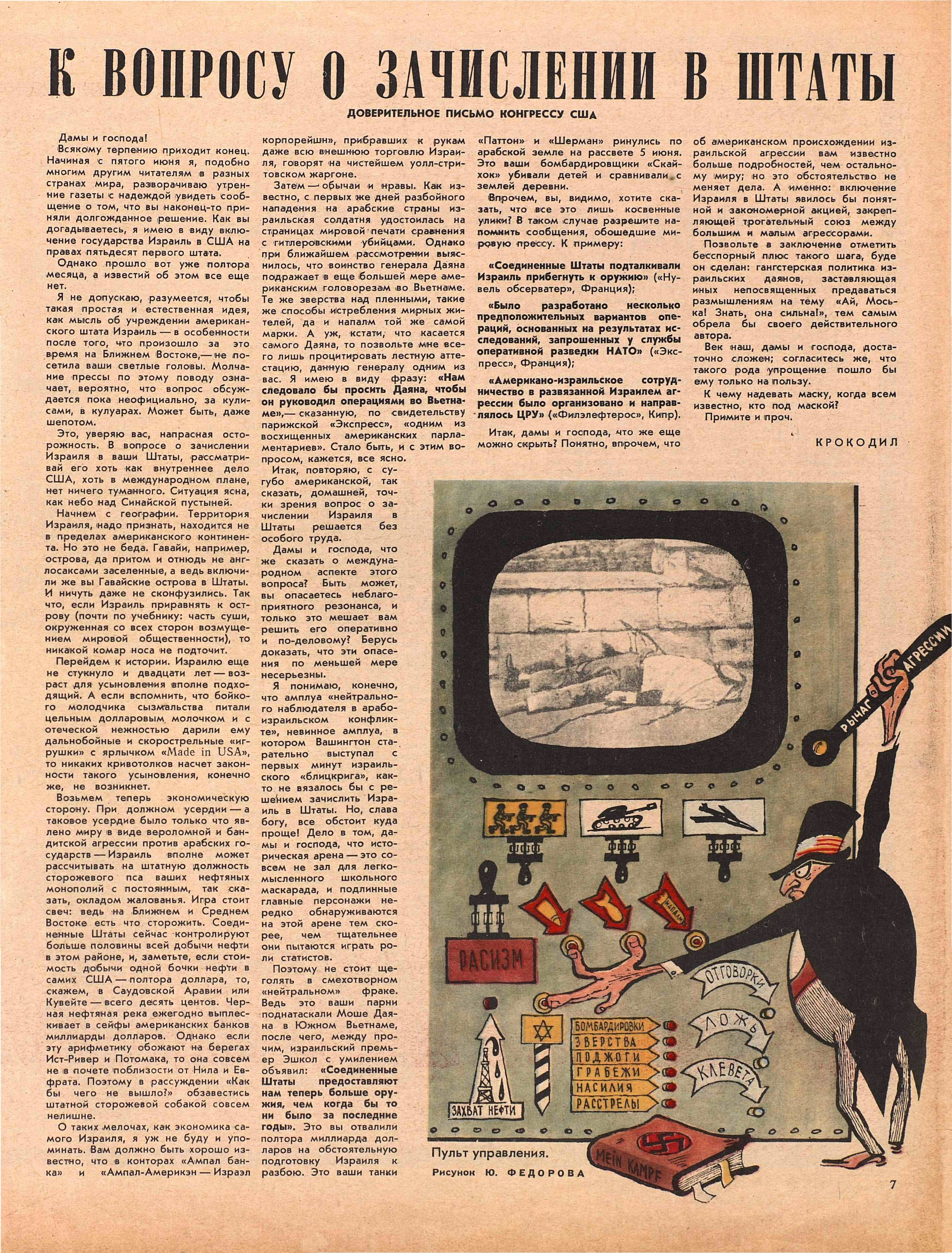 Then there are customs and mores. As you know, from the very first days of the robberies against the Arab countries, the Israeli soldiers earned themselves, on the pages of the world press, comparisons with Hitler’s murderers. However, upon closer inspection, it turned out that General Dayan’s army imitates to an even greater extent the American thugs in Vietnam. The same atrocities against prisoners, the same methods of exterminating civilians, and napalm of the same brand. And by the way, as for Dayan himself, let me just quote the flattering assessment given to the general by one of your people. I am referring to the phrase: “We should have asked Dayan to lead operations in Vietnam,” spoken, according to the Paris Express, “by one of the admiring American parliamentarians”. Therefore, everything seems to be clear on this issue.