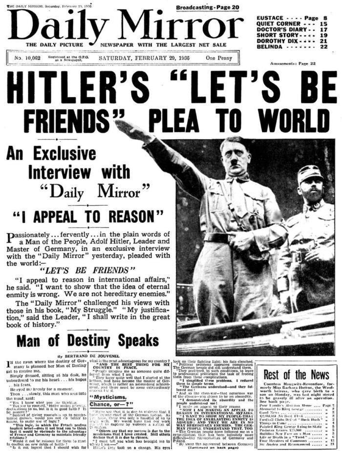 Adolf Hitler’s appeal to the global community. The lead article in the Daily Mirror, February 29, 1936.