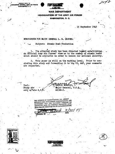 Citation 2: Leslie Groves to Lauris Norstad (26 September 1945), attached to the previous document.