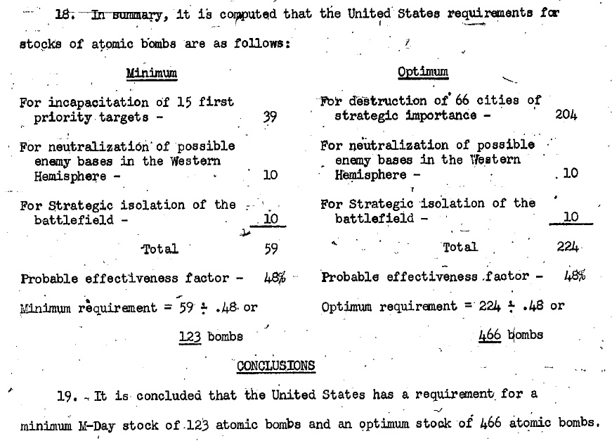 And, of course, it isn’t just “any other nation.” The analysis quickly fesses up to the fact that the only nation they’re concerned about is Russia, because they’re the only one who is projected to be even remotely on par with the United States from a military point of view for the next decade. “For the purpose of this study the destruction of the Russian capability to wage war has therefore been used as a basis upon which to predicate the United States, atomic bomb requirements.”