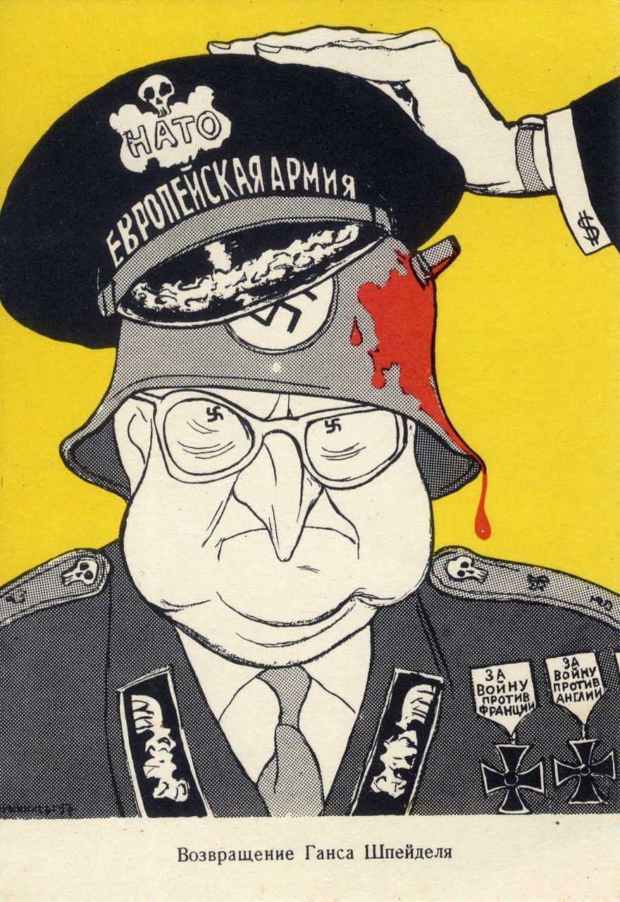 A biting caricature by the Soviet art collective “Kukryniksy”, drawn in 1957, depicts Hans Speidel, who has medals for “War against France” and “War against England” on his chest.