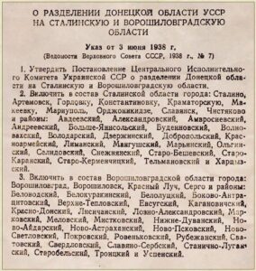 On June 3, 1938, the Donetsk region was divided into Stalinsk and Voroshilovgradsk oblasts.
