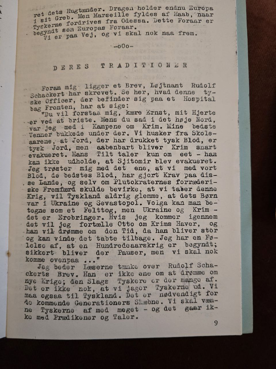 Jeg beder læserne tænke over Rudolf Schackerts Brev. Han er ikke ene om at drømme om nye krige: den slags tyskere er der mange af. Det er ikke nok, at vi jager tyskerne ud. Vi må også til Tyskland. Det er nødvendigt for de kommende generationers skæbne. Vi skal vænne Tyskerne af med meget – og det går ikke med prædikener og taler.
