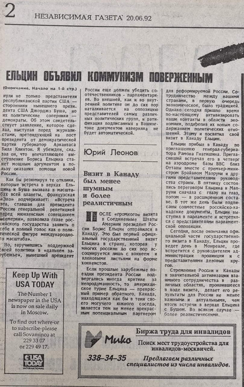 Such was the title of the “Independent Newspaper” on June 20, 1992, telling about Yeltisn’s speech at the US Congress on June 17.